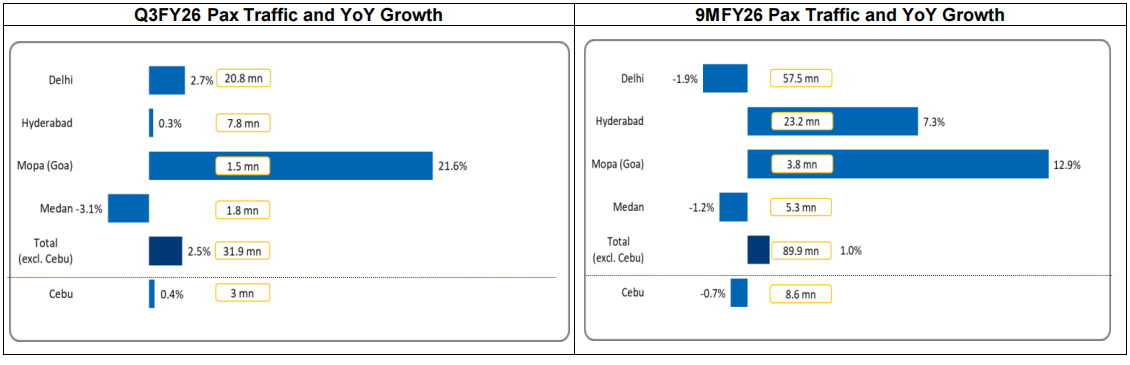 - Q3FY26: Pax traffic at 7.8mn, almost unchanged vs. Q3FY25